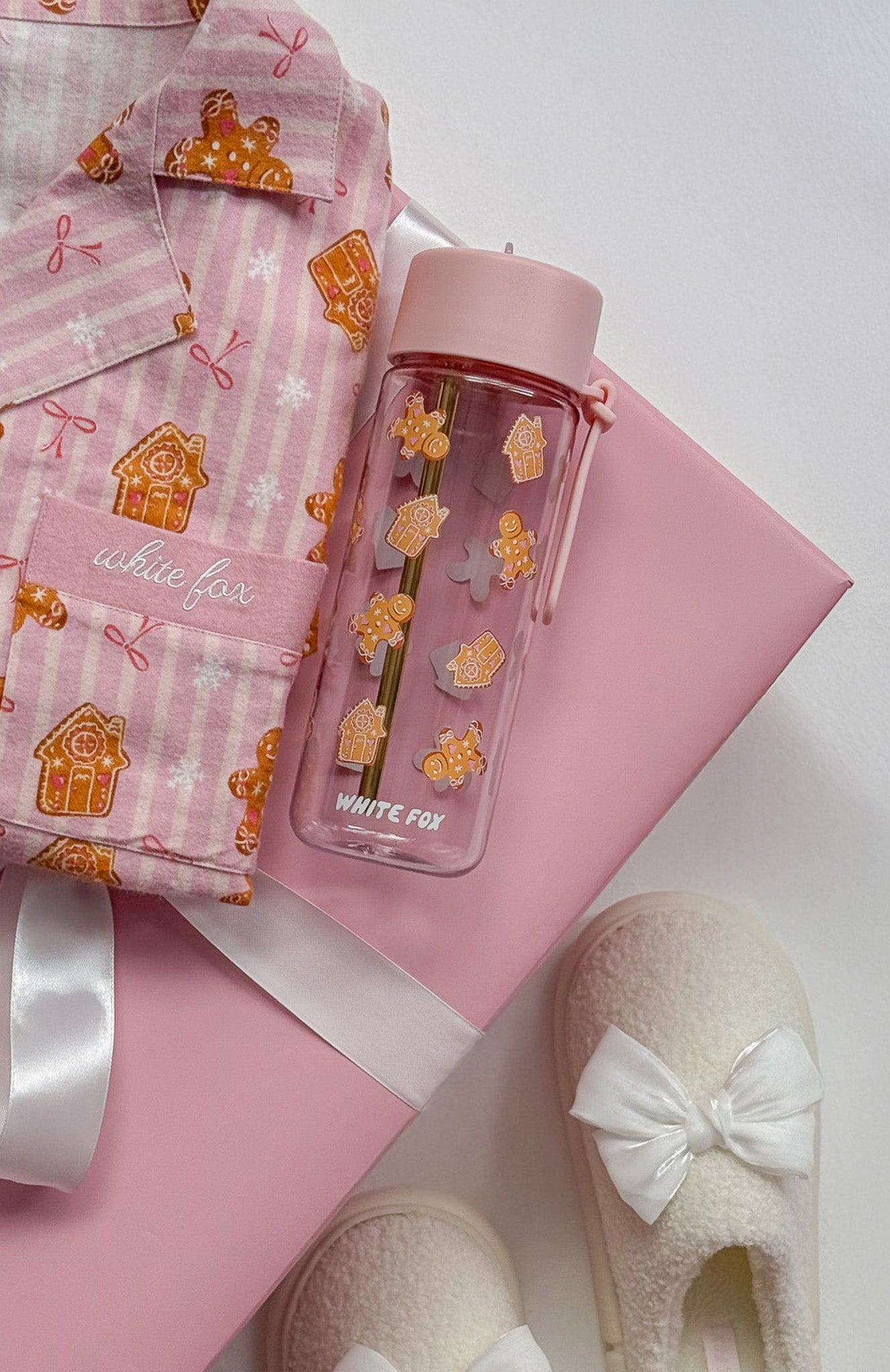 Add a dash of festive fun to your daily hydration with the Averill Drink Bottle 740ml in Gingerbread Twist. This charming bottle boasts a pop-up straw, a transparent body adorned with a gingerbread graphic and 'White Fox' text, complemented by gold-tone straw and an attached carry strap. It's the perfect blend of functionality and holiday cheer.