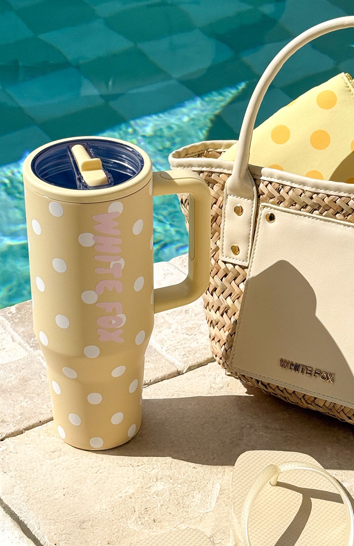 Cousins Beach, bikini on, and your new fave drink bottle in hand! The Colson Drink Bottle 1.2L in Lemon Polka Dot features a screw-off lid with a flip straw, oversized handle, and cupholder-compatible design. Finished with White Fox text down the side and a playful polka dot print, it’s the ultimate summer essential.