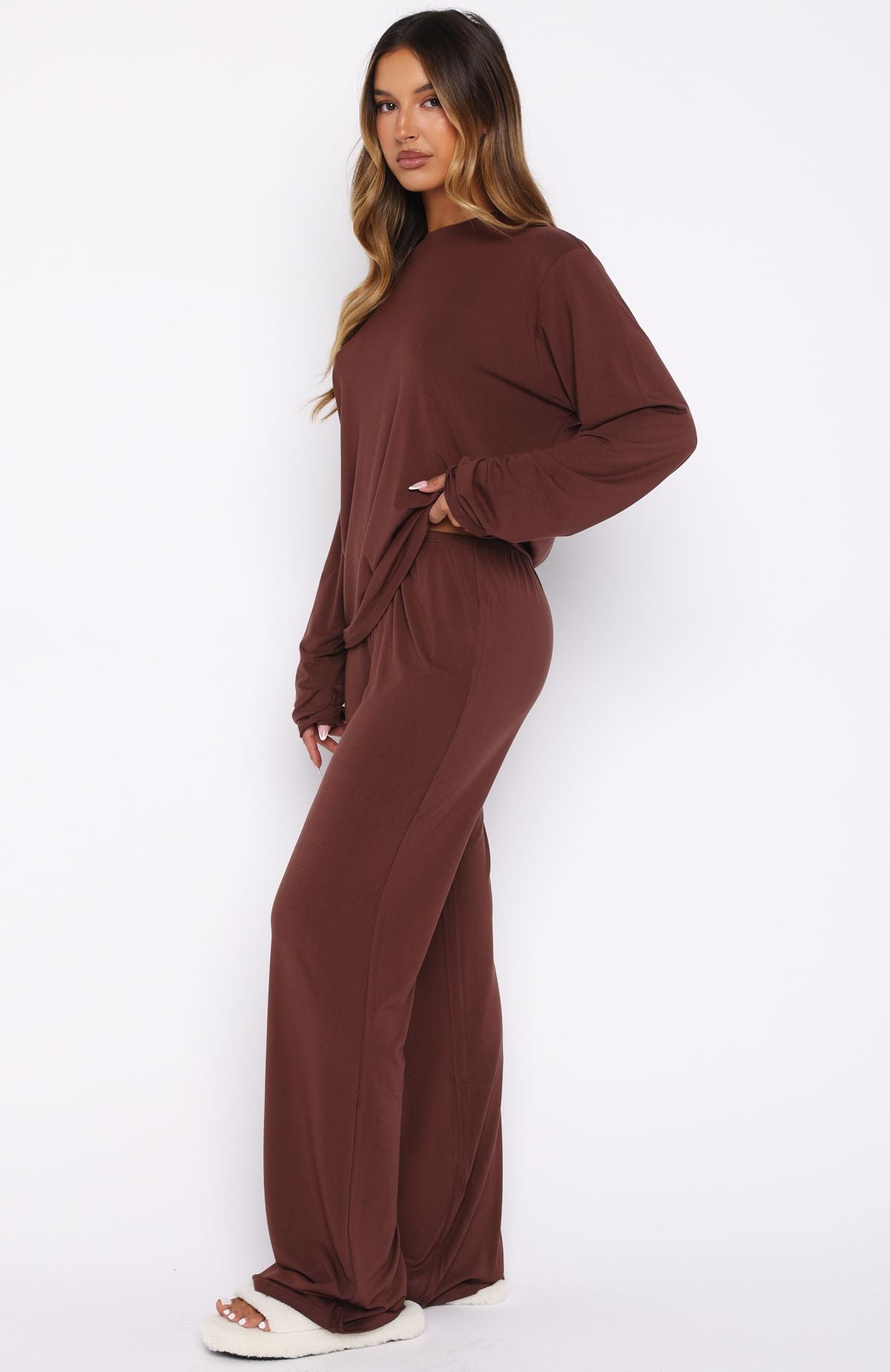 Sink into slow-luxe lounging. The Slow Life Pyjama Pants Chocolate features a thin elasticated waistband, relaxed wide leg design and the softest fabric to lazy around in. Style with the matching Slow Life Off Shoulder Oversized Pyjama Tee Chocolate or low Life Long Sleeve Pyjama Top Chocolate.